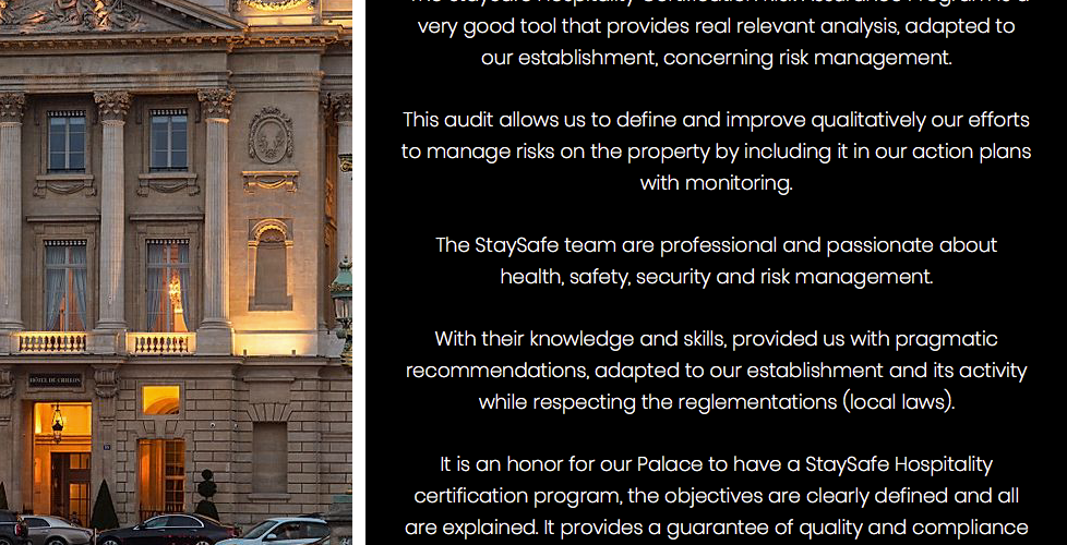 The StaySafe Hospitality Certification program is recognized by leading hotel groups, travel companies, and businesses in the hotel & travel industry. StaySafe provides a fresh approach to enable hotels to manage their risks. Developed and managed by hospitality professionals, the tools, audits, and standards are all generated with a goal to continually improve the risk standards in the hospitality sector.